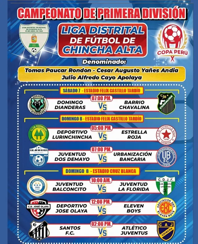 Domingo Dianderas puso primera en la Liga Distrital de Chincha Alta y lo hizo con una goleada que no pasó desapercibida. El sábado 7 de febrero, desde las 7:00 p.m., el equipo debutó ante Barrio Chavalina en el estadio Félix Castillo, en el partido correspondiente a la fecha 1 de la Primera División distrital.