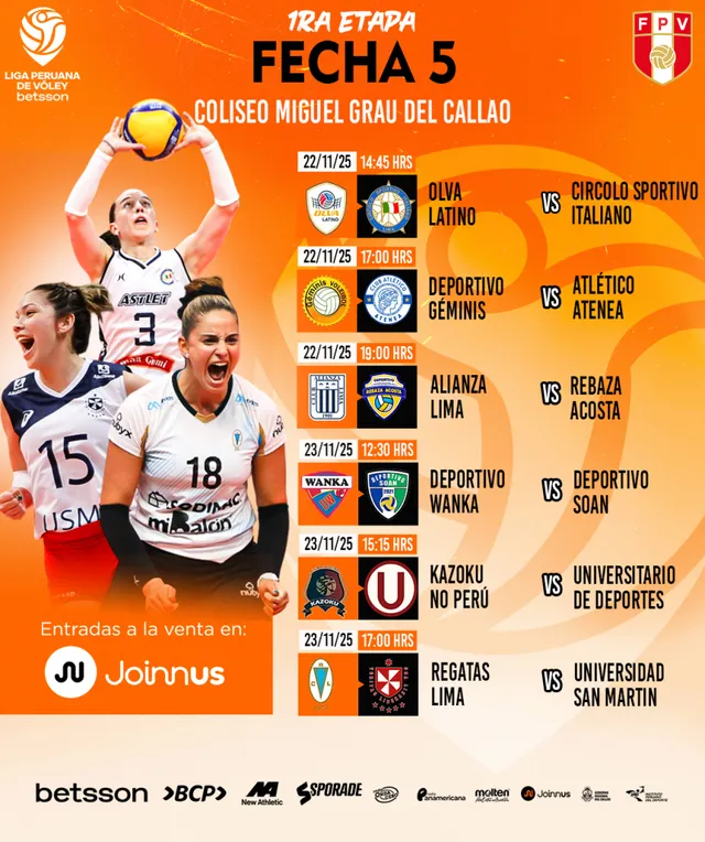 La Liga Peruana de Vóley sigue encendida y ya dejó lista la programación de la fecha 5 de la primera etapa. Sí, gente, el fin de semana del 22 y 23 de noviembre promete mover la tabla y dejar varios duelos para comentar largo y tendido. La Federación Peruana de Vóley soltó el fixture completo, y vaya que hay partidos que pintan para romper el coliseo Miguel Grau del Callao.