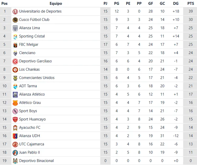 Universitario sigue en lo más alto con 39 puntos e invicto. Cusco FC (30) y Alianza Lima (28) completan el podio. En la parte baja, UTC (13) y Juan Pablo II (11) siguen comprometidos con el descenso.