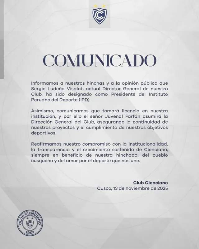 Esta noticia también fue confirmada por Cienciano, club donde Ludeña venía ejerciendo como administrador. Desde la institución cusqueña anunciaron que su ahora exdirectivo tomará licencia para dedicarse de lleno a su nueva responsabilidad en el deporte nacional. En paralelo, comunicaron que Juvenal Farfán asumirá el rol de director general del club, con la consigna de seguir con los proyectos ya trazados y sostener los objetivos competitivos del equipo imperial.