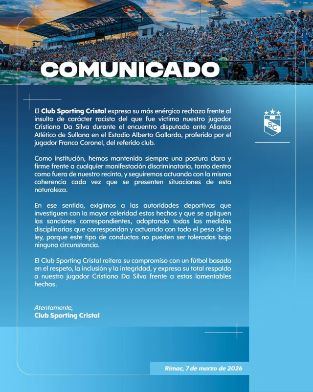 Luego del partido, Sporting Cristal publicó un comunicado rechazando lo ocurrido durante el encuentro en el Alberto Gallardo.