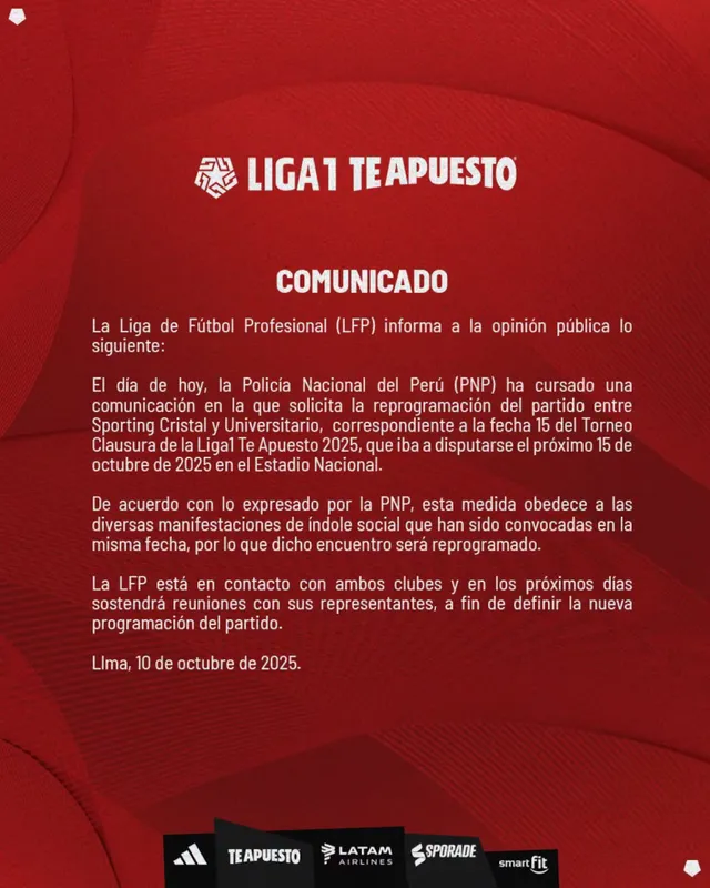 “La PNP ha cursado una comunicación en la que solicita la reprogramación del partido entre Sporting Cristal y Universitario, correspondiente a la fecha 15 del Torneo Clausura de la Liga 1 Te Apuesto 2025, que iba a disputarse el 15 de octubre en el Estadio Nacional”, informó la Liga en su comunicado.