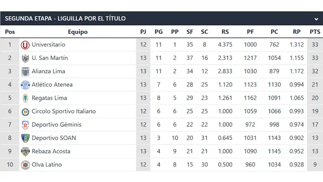 Tras estos encuentros, la tabla quedó ajustada. Universitario y San Martín lideran con 33 puntos, con las santas habiendo disputado un partido más. Alianza Lima aparece tercera con 32 y sigue al acecho. Regatas se metió cuarta con 20 unidades, mientras que Atlético Atenea marcha quinta con 21. Circolo Sportivo Italiano y Deportivo Géminis sostienen su lugar entre los ocho primeros, aunque sin margen para errores.