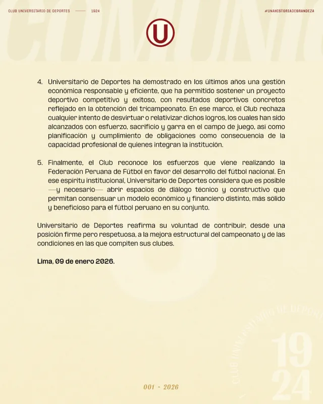 Desde la ‘U’ señalaron que resulta necesario revisar este sistema con seriedad, pensando en un futuro más ordenado para el campeonato local. La idea, según el comunicado, es avanzar hacia un modelo que permita previsibilidad financiera y ayude a fortalecer el producto del fútbol peruano, algo que hoy parece lejano para muchos clubes.