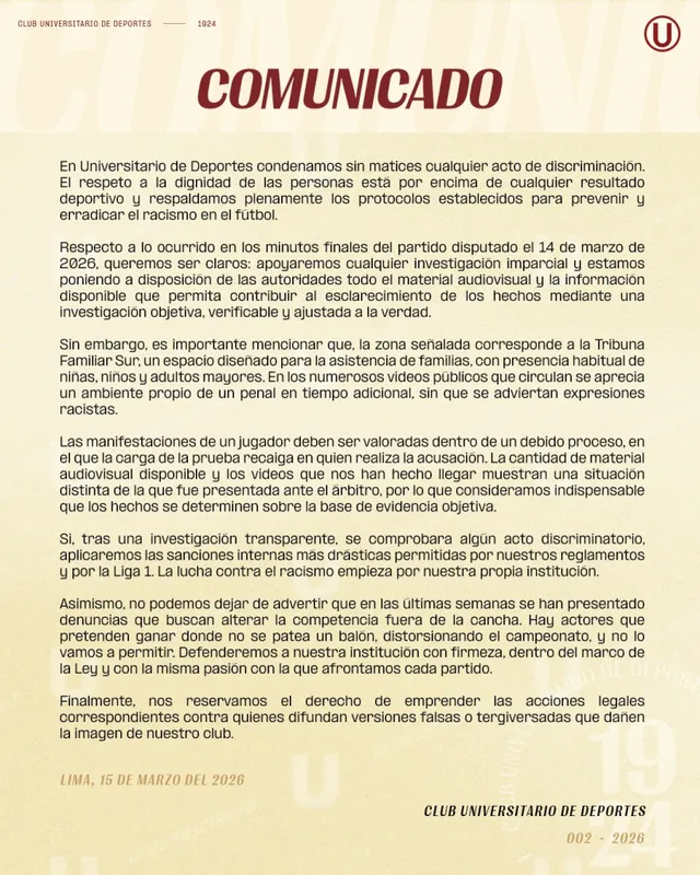 Eso sí, el mensaje del club también fue claro en otro punto. Si tras las investigaciones se confirma que existió algún acto discriminatorio, Universitario aplicará las sanciones internas más severas que permite su reglamento y el de la Liga1.