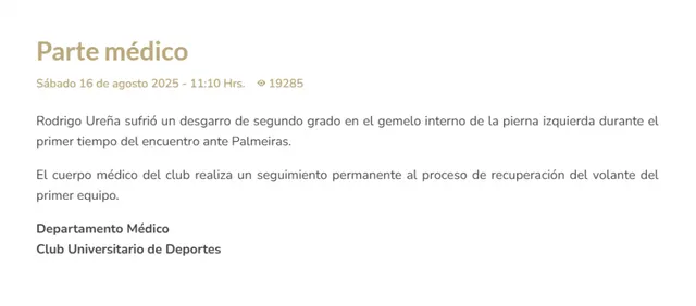 El hincha crema amaneció con malas noticias. Universitario confirmó este sábado que Rodrigo Ureña, uno de los motores del mediocampo de Jorge Fossati, sufrió un desgarro de segundo grado en el gemelo interno de la pierna izquierda y estará fuera de las canchas al menos tres semanas.