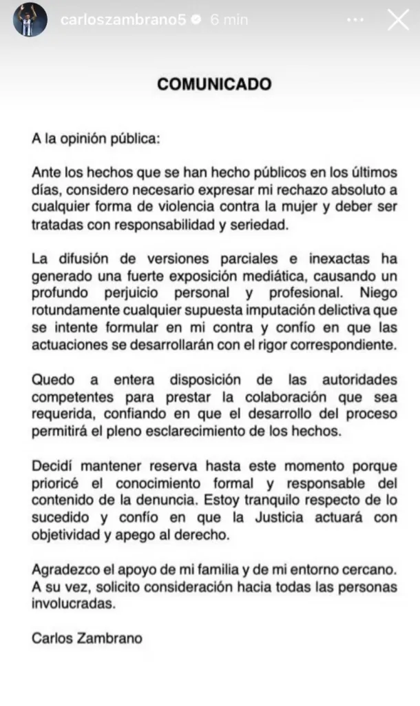 Carlos Zambrano rompió su silencio. Luego de que se hiciera pública una denuncia en su contra por presunto abuso sexual ocurrida en Uruguay, el defensor de Alianza Lima utilizó su cuenta oficial de Instagram para fijar posición y dar su versión de los hechos, en un contexto que ya tuvo consecuencias deportivas inmediatas: el club decidió separarlo de la disciplina del plantel.