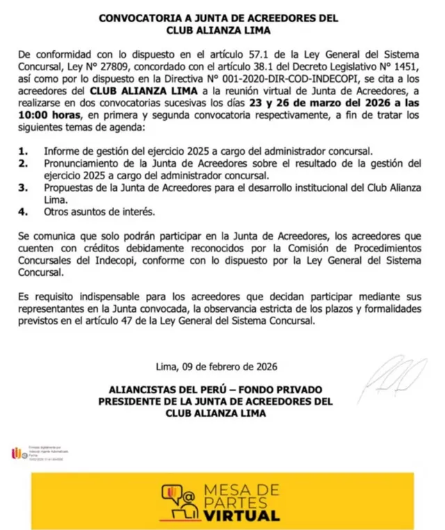 Según el documento oficial difundido por Aliancistas por el Perú, la Junta de Acreedores se realizará de manera virtual en dos fechas programadas para garantizar la participación de los integrantes. La primera convocatoria fue fijada para el lunes 23 de marzo de 2026, mientras que la segunda se realizará el jueves 26 del mismo mes, ambas en horario matutino.