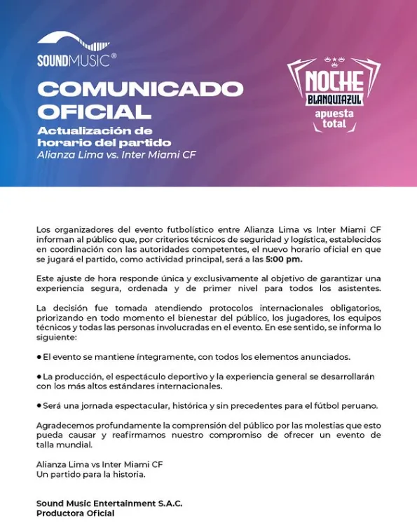 Desde Sound Music Entertainment señalaron que la decisión responde a protocolos internacionales obligatorios, priorizando el bienestar del público, jugadores, cuerpos técnicos y todo el personal involucrado. También remarcaron que la Noche Blanquiazul se mantiene completa, con todos los elementos anunciados, tanto en lo deportivo como en el espectáculo.