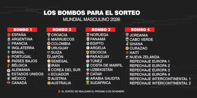 El sorteo se llevará a cabo este viernes 5 de diciembre en el Kennedy Center de Washington D. C. Allí se formarán los 12 grupos de cuatro equipos, el formato que debutará en esta edición. A esa altura del evento quedarán definidos los rivales de las 42 selecciones clasificadas, mientras que los cuadros que lleguen desde la repesca ocuparán las plazas que aún están por llenarse. La repesca intercontinental, programada para marzo del 2026, se jugará en Monterrey y Guadalajara.